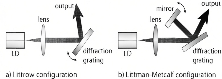 Laser rongga utama dengan rongga pendek seperti DFB dan DBR memiliki waktu interaksi foton intra-rongga yang terbatas, sehingga menyulitkan kompresi lebar garis yang dalam. Untuk lebih memampatkan lebar garis dan menekan kebisingan, konfigurasi rongga utama rongga pendek seperti itu sering kali digabungkan dengan struktur rongga eksternal untuk optimalisasi kinerja. Struktur rongga eksternal yang umum mencakup rongga eksternal spasial, rongga eksternal serat, dan rongga eksternal pandu gelombang. Sebelum pengembangan perangkat serat optik dan struktur pandu gelombang, rongga eksternal sebagian besar terdiri dari optik spasial yang dikombinasikan dengan komponen optik diskrit. Di antaranya, struktur umpan balik rongga eksternal spasial berbasis kisi terutama mengadopsi desain Littrow dan Littman, biasanya terdiri dari rongga penguatan laser, lensa kopling, dan kisi difraksi. Kisi, sebagai elemen umpan balik, memungkinkan penyetelan panjang gelombang, pemilihan mode, dan kompresi lebar garis.